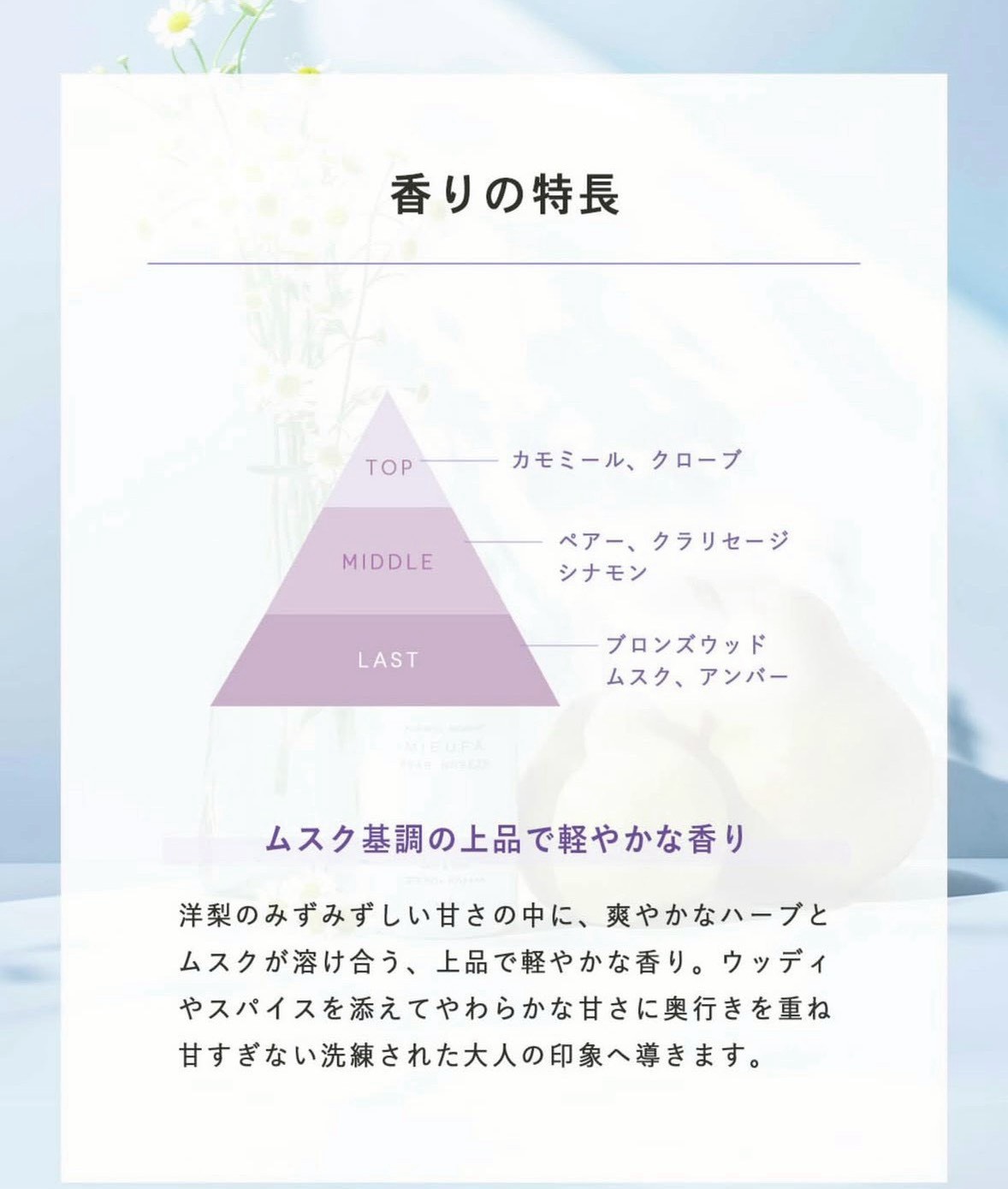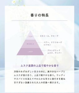 洋ナシのみずみずしい甘さの中にさわやかなハーブとムスクが混ざった上品な香りです(^^♪